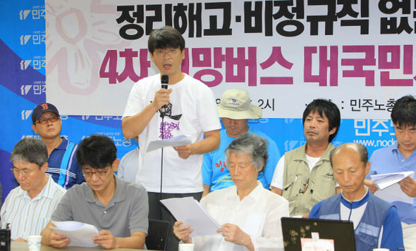 ‘希望のバス企画団’は8日、ソウル、中区の全国民主労働組合総連盟大会議室で記者会見を行い「(韓進重事態と関連した)政府の責任ある回答を要求するためにソウルで4次希望のバスの始動させる」とし「キム・ジンスクと韓進重工業整理解雇者などに対する慰労と情緒的連帯を越え、実質的に彼らが85号クレーンから降りられる具体的な行動に出る」と明らかにした。