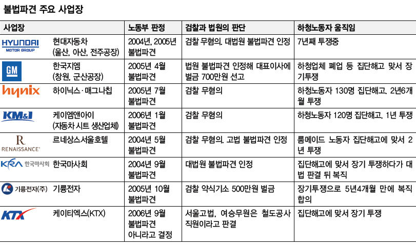検察も労働部が不法派遣と判定した事件に対して常に無嫌疑処分を下し企業に‘免罪符’を与え、起訴しても罰金刑がその全てだった。 5年4ヶ月間‘命をかけて’戦って正規職化を実現したキリュン電子と5年ぶりに最高裁で勝訴し元請けに直接雇用された韓国馬事会の社内下請け労働者たちの成果がかろうじて目につく程度だ。 キム・ソヨン金属労組キリュン電子分会長は「企業は法を無視しても何の処罰も受けず、不法派遣労働者だけが集団解雇にあい闘争して拘束されるなど一方的に被害を受けることが今も反復されている」として「不法派遣問題を見れば‘無銭有罪、有銭無罪’の現実を痛感する」と話した。 彼は「強い処罰がないために不法派遣が大手を振って歩いている」と強調した。 現行派遣法には不法派遣をすれば3年以下の懲役または2千万ウォン以下の罰金に処すると規定されている。