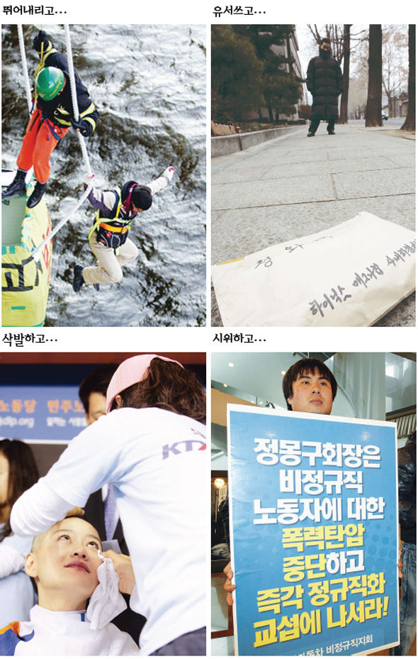 韓国GM(旧 GM大宇),ハイニックス・マグナチップ、KTX,現代自動車などの社内下請け労働者たち(左側から)は不法派遣認定にともなう正規職化を要求し長期闘争を行ったが、未だ正規職に転換されていない。左上写真は去る2008年に全国金属労働組合GM大宇自動車非正規職支会所属の解雇労働者イ・ジュンサム(31)氏がソウル、麻浦(マポ)大橋欄干から綱でぶら下げたカゴに入り社内下請け解雇労働者たちの復職を要求する示威を行い、119救助隊が近づくや漢江(ハンガン)に飛び降りた場面だ。 <ハンギョレ>資料写真
