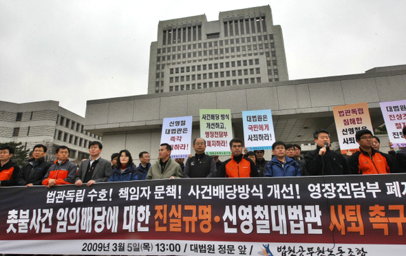 夜間集会を禁止した集示法に対する違憲法律審判が推薦された以後刑事単独判事らにろうそく集会事件を早く処理しろとのシン・ヨンチョル最高裁判事(当時ソウル中央地裁所長)の要求は執拗だった。シン最高裁判事はイ・ヨンフン最高裁長官の意中や憲法裁判所の違憲審判進行状況にまで言及し判事らを圧迫した。