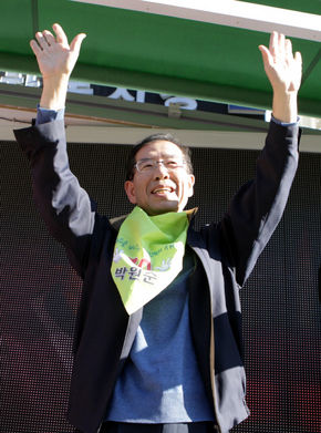 ←パク・ウォンスン ソウル市長野党圏単一候補が25日午後、ソウル、道峰区(トボング)、倉洞(チャンドン)新倉市場前で支持を訴え手を振っている。 カン・チャングァン記者