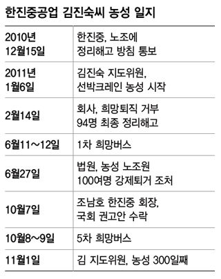 キム・ジンスク(51)全国民主労働組合総連盟釜山本部指導委員の籠城が1日で300日を迎え、労使交渉の妥結を促す声が高まっている。韓進重工業労使交渉チームは2日午後、韓進重工業釜山影島造船所新館1階会議室で再び会い‘1年以内に整理解雇者などを再雇用し解雇期間につき労働者1人当り2000万ウォンの生計費を支援する’という先月7日の国会環境労働委員会の勧告案を巡り交渉を行う予定だ。だが、この日の交渉で両者が意見接近できる可能性は高くないとの観測が一般的だ。労使が環境労働委の勧告案を大きな枠組みでは受け入れるとしながらも1ヶ月近くの交渉に産みの苦しみを味わっているのは細部事案を巡り異見を狭められないためだ。