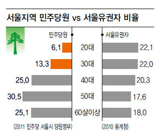 <ハンギョレ>が7日入手した民主党ソウル市党員名簿を見れば、31万8000人余りに及ぶソウル市党員の中で20代(19~29才)の比率は6.1%、30代の比率は13.3%に過ぎないことが分かった。 これはソウル市有権者全体の中で20代と30代の比率22.1%と22.0%(2010年統計庁資料)に遥かに至らない。20代党員比率は20代全体の4分の1水準で、30代は半分を若干上回る程度に終わった。