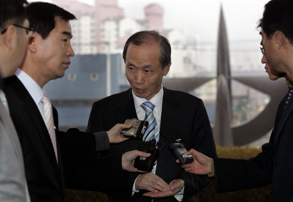 ←イ・ヨンフン大法院長が6日午前、ソウル,瑞草洞の大法院に出勤して記者らの質問に答えている。 キム・ミョンジン記者littleprince@hani.co.kr