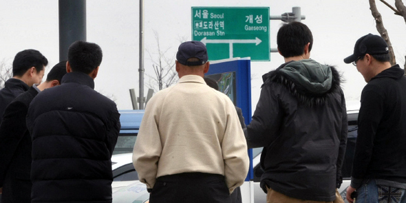 ←凍りついた南北どこへ。北韓が韓-米連合キーリゾルブ軍事訓練を理由に南北間の軍通信線を遮断し、開城工業団地入出境手続きが中断された9日午前、京畿,坡州市の都羅南北入出事務所で開城工業団地に行こうとしていた企業と公団の関係者たちが北韓訪問手続き再開を待って話を交わしている。 都羅山/キム・ジンス記者jsk@hani.co.kr