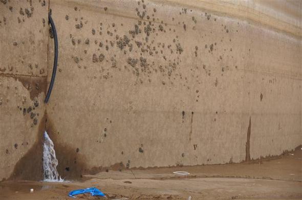 ←4大河川事業で政府が洛東江(ナクトンガン)上流に作った慶北(キョンブク)亀尾(クミ)堰でコンクリート翼壁の下から11mの高さまで4~5㎝ほど亀裂の入った隙間から水が洩れている。 パク・チャングン関東(クァンドン)大教授提供