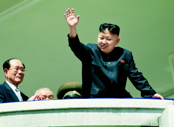 ←金正恩北韓朝鮮労働党第1秘書が15日平壌(ピョンヤン)金日成広場で金日成主席の生誕100周年を記念する閲兵式を観覧して手を振っている。 左はキム・ヨンナム最高人民会議常任委員長. 平壌/APニューシス