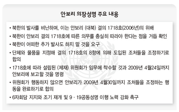 今回の議長声明のまた別の特徴は、2006年10月採択以後6者会談の再開で事実上開店休業状態であった安保理決議1718号に再び言及しているという点だ。特に対北制裁団体と物品目録を24日までに作成するようになっている。この間1718号で指定した△武器禁輸△資産凍結△旅行禁止など3種の対北制裁措置の中で武器禁輸だけが作動し、資産凍結と旅行禁止は対象目録が作成されていなかった。このように今回の議長声明は強制的拘束力はないが、政治的意志によっては安保理決議1718号を生き返らせることができ各国がこれに基づいて対北制裁に出ることができる根拠になりうる。