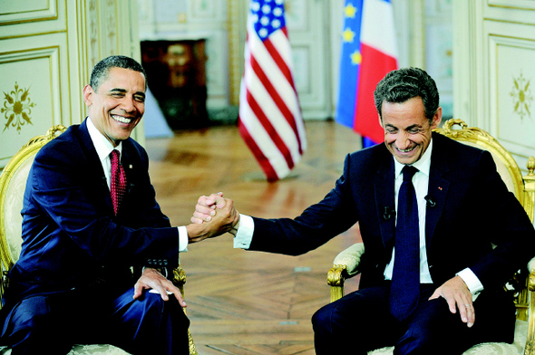 ←バラク・オバマ米国大統領(左側)が6日フランス カンヌでニコラ・サルコジ フランス大統領と首脳会談をする前に握手をしながら明るく笑っている。オバマ大統領はこの日「北韓のここ数ヶ月間の行動は途方もなく挑発的」と話した。カン/AP連合