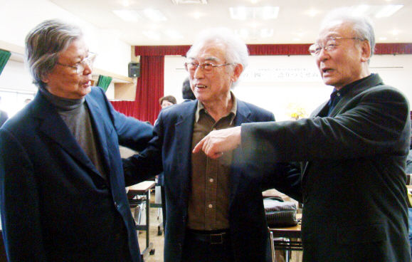 ←済州出身で在日同胞文学界を代表する小説家 梁石日・金石範、詩人キム・シジョン(左側から)氏が16日 日本、東京で開かれた4・3第63周年追悼会に参加して4・3の国際化と平和連帯について議論している。 ホ・ヨンソン氏提供