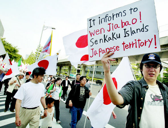 ← "日本の領土" 去る3月21日、温家宝中国総理が地震被害地域を訪問した当時、日本のデモ隊が東京で‘尖閣諸島(中国名 釣魚島)は日本の領土’という立て札を持ち集会を行っている。東京/APニューシス