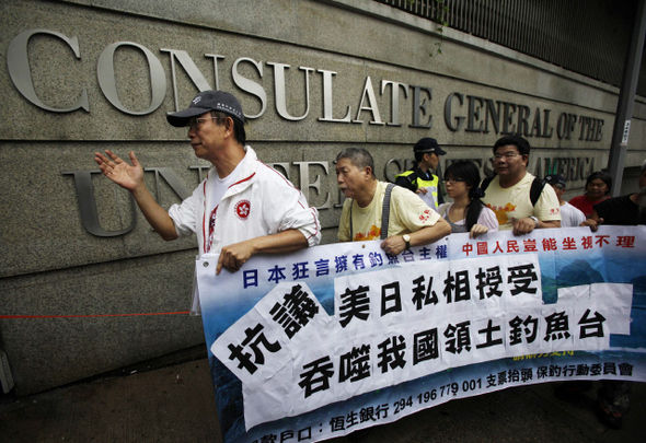 ← "中国の領土" 去る6月16日、香港の米国領事館前でデモ隊が‘中国土地である釣魚島(日本名 尖閣諸島)を奪い取ろうとする米国・日本の秘密取引に抗議する’という横断幕を持ち集会を行っている。 香港/ロイターニューシス