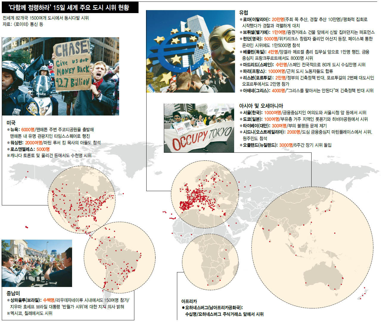 ←‘みな一緒に占領せよ’15日、世界主要都市デモ現況(※イメージをクリックすれば大きく見ることができます)