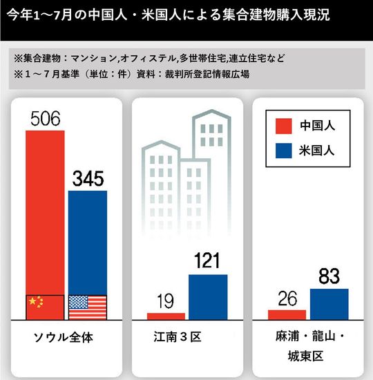 むしろ、江南3区と麻浦・龍山・城東区エリアの住宅を大量購入したのは米国人だった。今年1~7月、米国人によるソウル市内の集合建物の取引は計345件だが、このうち江南3区が121件、麻浦・龍山・城東区が83件で取引量全体の60%に肉迫した。今年のソウル市内の取引件数が100件であるカナダ人の購入も米国人と同じような様相だった。ソウル市江南区のある公認仲介士は「江南圏でマンションを買う米国人はほとんどが韓国系米国人」だとし「海外同胞ではない外国人取引は受けたことがない」と語った。