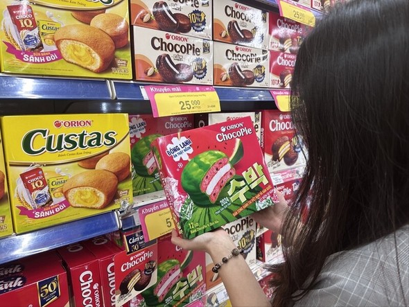 オリオンも昨年ベトナムで発売したチョコパイ夏限定版「スイカ味」の表面に「スバク」というハングル表記をそのまま使用。現地の言語に翻訳せず、ハングルをそのまま用いたのだ。同年、ベトナムで発売した「コブクチップス」は、現地の製品名として韓国語の「おいしい」を英語で表記した「マシタ(Masita)」が用いられている。ハングルという文字にとどまらず、韓国語をマーケティングの要素にしたのだ。オリオンの関係者は「(現地市場で)韓国製品は人気がある。ハングルにも非常に関心が高いため、ハングルを用いた製品が増えている」と話した。