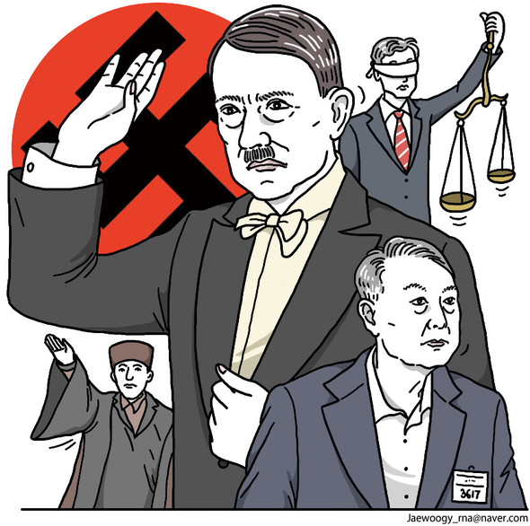 1932年の総選挙で3分の1の得票率と議席で権力を握ったヒトラーは、直ちに授権法(全権委任法)を成立させた。内閣に独自の立法権を与え、三権分立を事実上解体し、ヒトラーに合法的独裁の道を開いた魔法のランプだった。ナチス一党独裁、政治犯の粛清、人種主義と優生学に基づいた虐殺、言論統制など、あらゆる国家暴力が法の名の下で認められた。その背後には「司法エリート」たちがいた。授権法を設計したフランツ・ギュルトナーは、ワイマール共和国に続きナチス政権でも法相を務めた。ハンナ・アーレントはユダヤ人虐殺の行政責任者だったアドルフ・アイヒマンの裁判を傍聴し「悪の凡庸さ」について語ったが、ナチス政権の法技術者たちは「悪の専門性と偽装術」を誇示した。