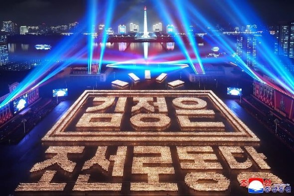 今月11日夜、平壌の金日成広場で開かれた「朝鮮労働党創建80周年祝賀・群衆デモおよび松明夜会」の様子。行事に参加した市民が作り上げた「朝鮮労働党」の文字の上に「金正恩」という文字が刻まれ、金総書記が朝鮮労働党を率いる「首領」という政治的シグナルを発信している/朝鮮中央通信・聯合ニュース