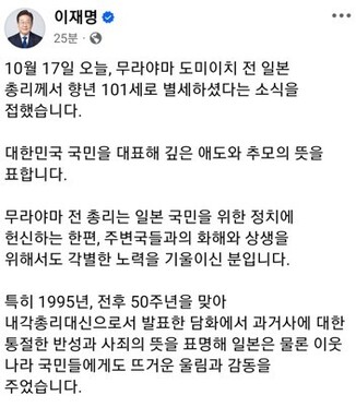 李大統領はこの日、フェイスブックへの投稿で「村山元首相は周辺諸国との和解と共生のためにも格別な努力を行った」とし、故人を追悼した。